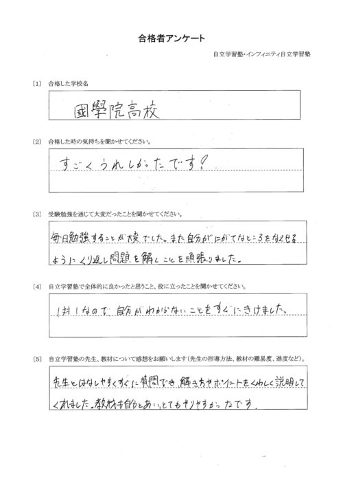先生と話しやすくすぐに質問でき、解き方やポイントを詳しく説明してくれました。教材も自分と合い、とてもやりやすかったです。