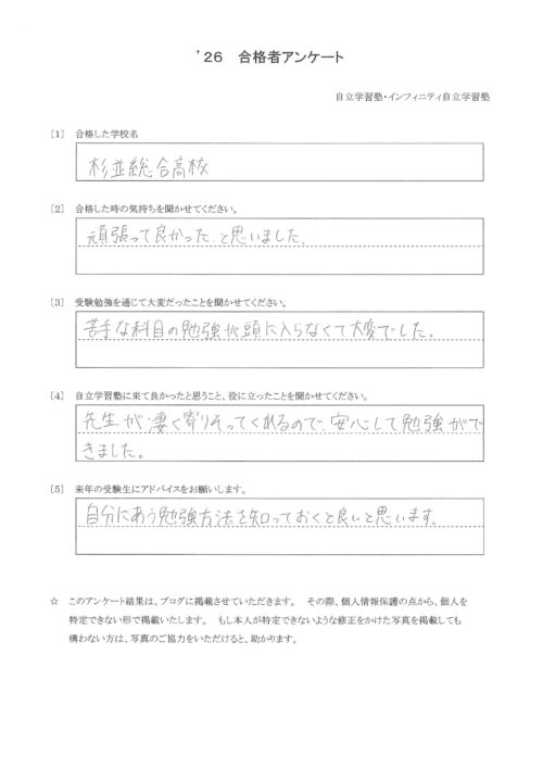 合格おめでとうございます。コツコツ頑張れる生徒さんです。地味な努力をしっかり行っている姿が印象的です。実を結んでホッとします。充実した高校生活をスタートできるように今日も頑張っていました。応援させてくださいね。これからも頑張っていきましょう!